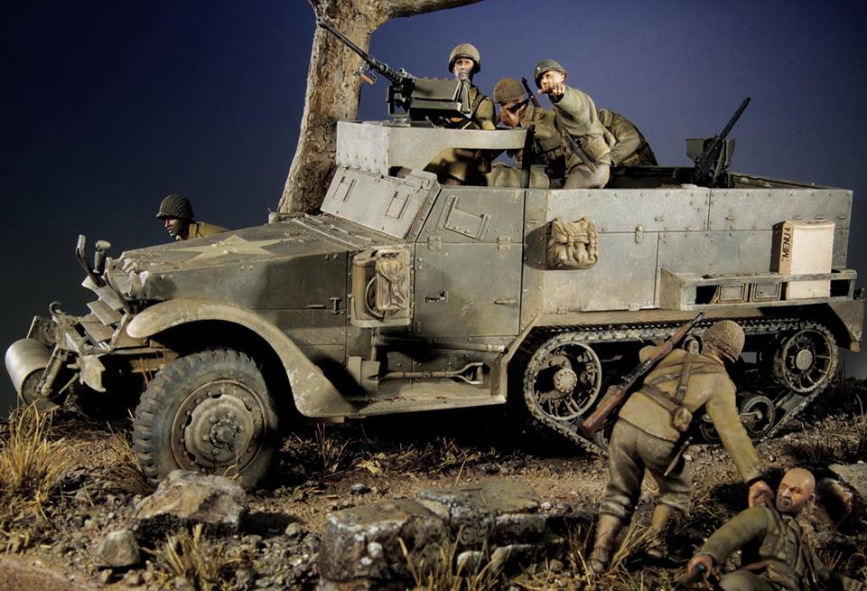 A 1/35th scale diorama. An officer has been wounded by sniper fire. As he is dragged to safety he points with his M1 Carbine to the suspected position of the sniper. In the halftrack a Lieutenant directs covering fire with it's .50 cal M2 Heavy Machine Gun as infantry lead by a Sergeant deploys.